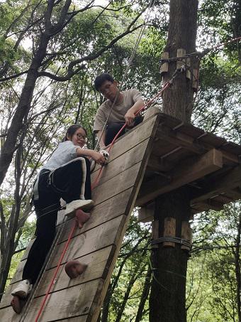 隊員們根據(jù)自己的體力挑選不同的線路,這項活動需要每個人獨立完成,活動現(xiàn)場不時能聽到尖叫、吶喊聲,還有隊員間相互的鼓勵和指導(dǎo)聲。整個運動中,也有隊員不慎滑落掛在半 空,隊員間的相互陪伴、安撫和鼓勵使得掛在半空也是另一種體驗,甚至覺得很享受。經(jīng)過一個小時左右時間,所有隊員都安全完成這項匯集高空、速度、力量、毅力的戶外探險活動。